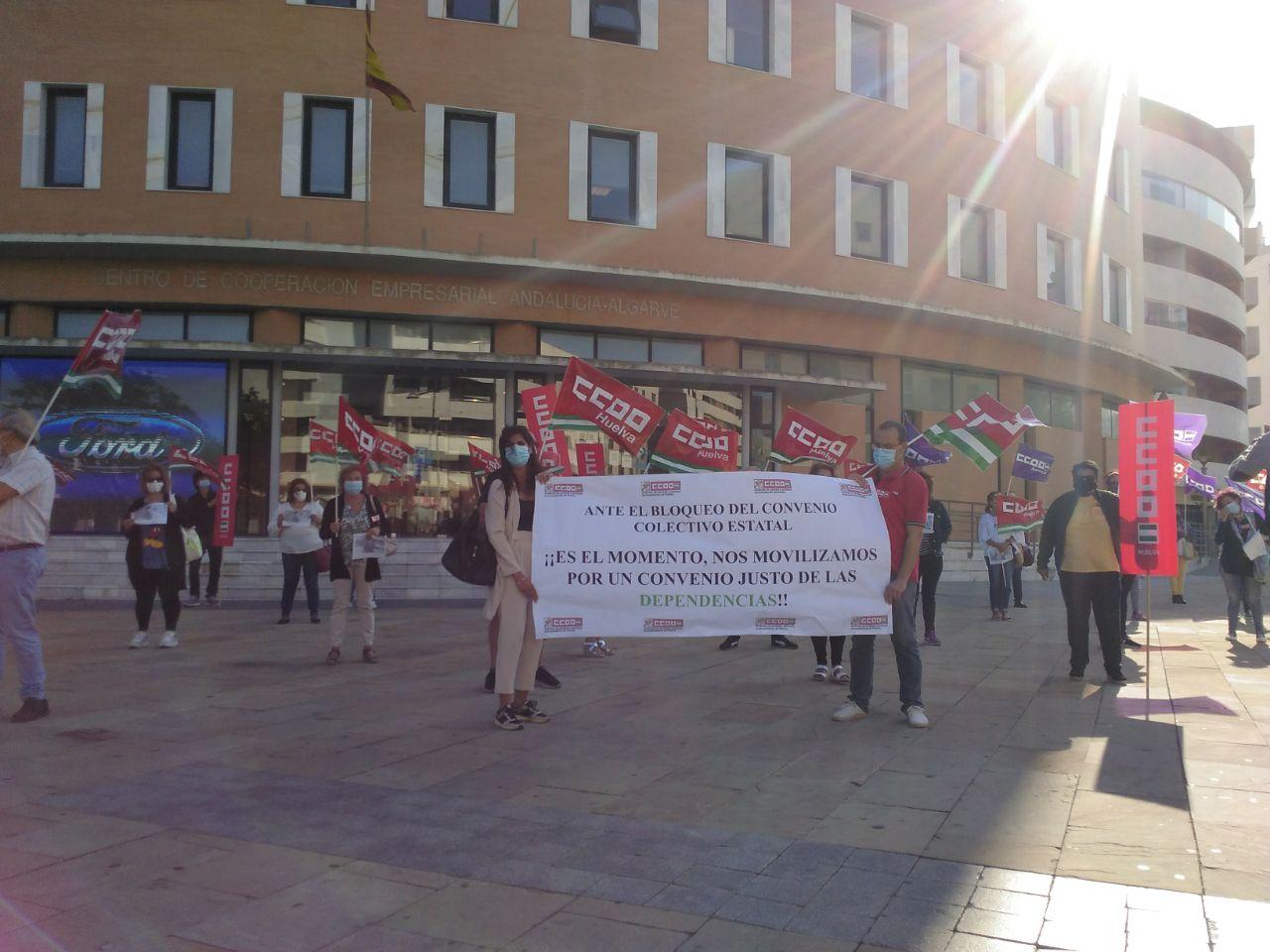 El 1 de Octubre, la Federación de Servicios Sociosanitarios de CCOO ha convocado concentraciones en todas las provincias de España, por el desbloqueo del convenio estatal del sector de la dependencia, reclamando también mayor financiación para mejorar las condiciones laborales y salariales, así como la atención a las personas dependientes. En Huelva, ésta se ha producido a las puertas de la FOE, a las 11:00h y han participado más de 60 delegados y delegadas del sindicato, así como representantes del PCA y de IU.