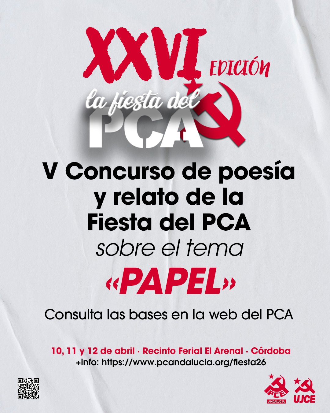 Con motivo de la celebración de la Fiesta del PCA 2026, el Partido Comunista de Andalucía, con la colaboración de la UJCE, convoca la quinta edición del Concurso de poesía y relato, en torno al tema «Papel