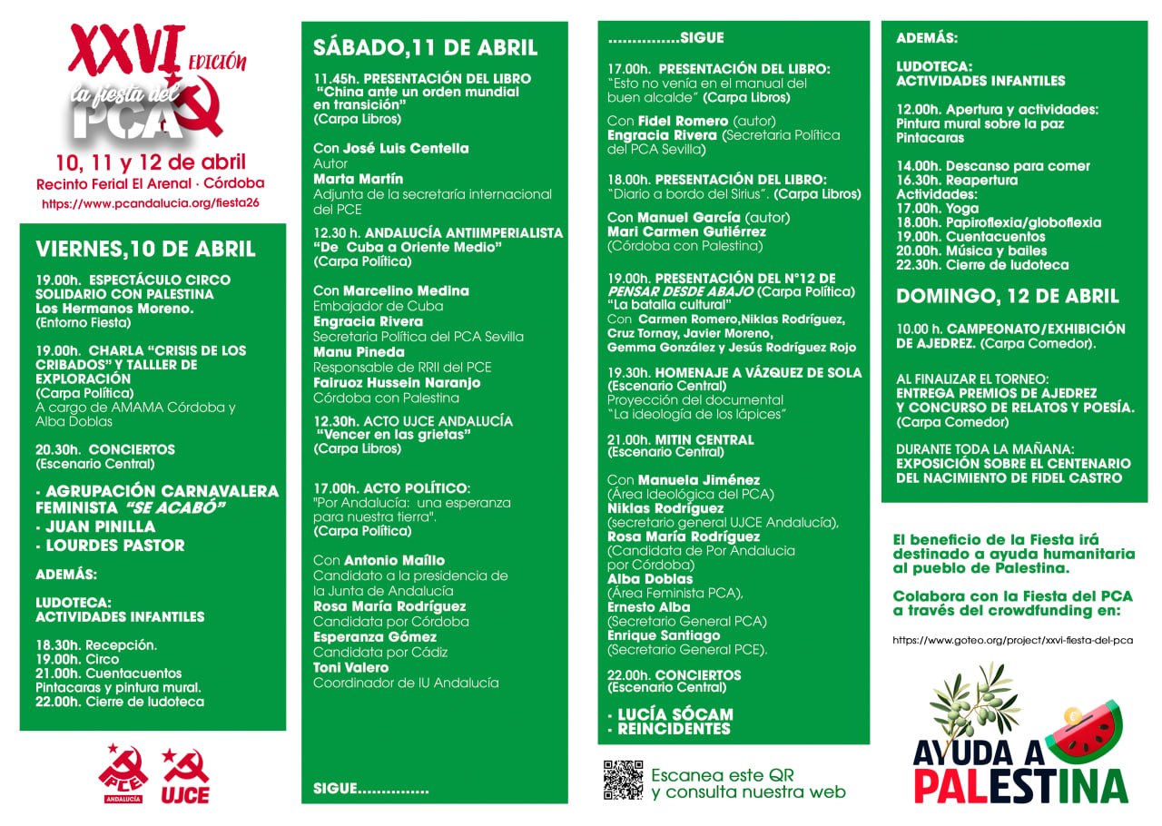 El Partido Comunista de Andalucía hace pública la programación completa de la XXVI Edición de la Fiesta del PCA, que tendrá lugar los días 10, 11 y 12 de abril en el Recinto Ferial “El Arenal” de Córdoba. Un evento consolidado como uno de los principales espacios de encuentro político, cultural y social de Andalucía, que combina reflexión crítica, celebración popular y compromiso militante. Asimismo, uno de los “platos fuertes” será el acto de Por Andalucía, la coalición electoral encabezada por Antonio Maíllo a las próximas elecciones del 17 de mayo.